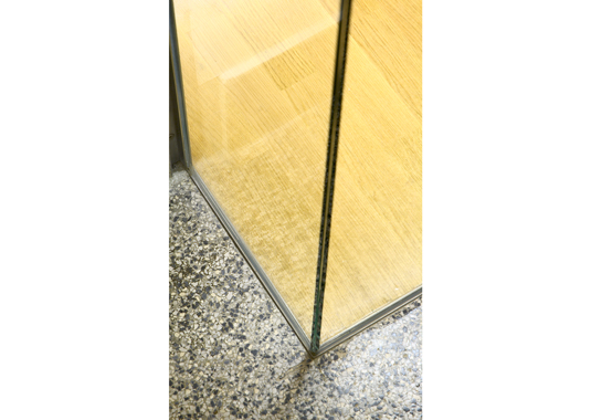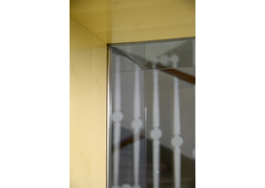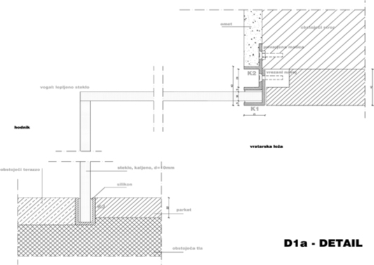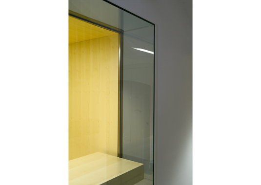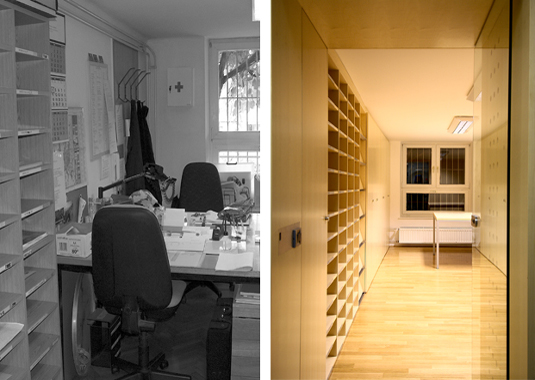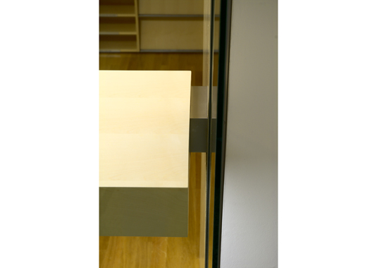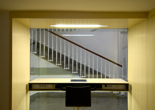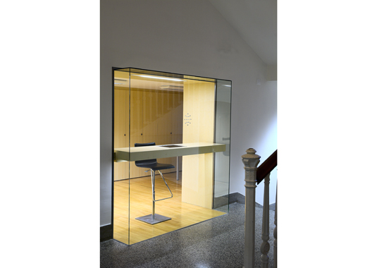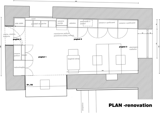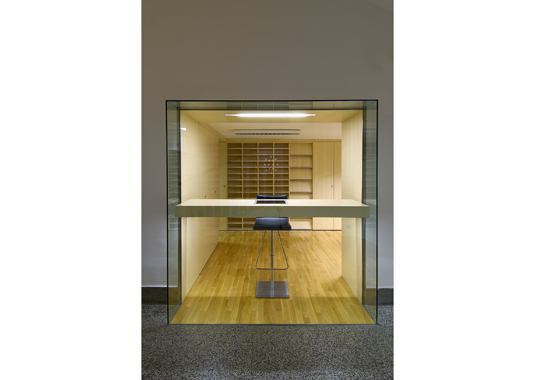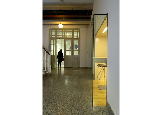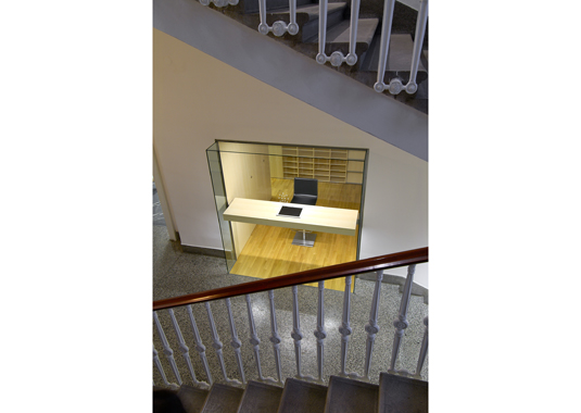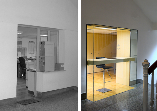 Golden pencil award 2004-2006 for best slovenian interior. The project’s goal was to renovate a small doorman’s booth in Ljubljana Faculty for Architecture. The booth is located on the most important “crossing” in the building – the main intersection of the horizontal and vertical path in the school. The room before renovation used to have a direct entrance overlooking to the main staircase and has been functioning as storage for numerous things. At the same time it was hosting a doorman, squeezed between boxes trying to see what is happening outside. After the renovation, the booth remains small. Despite that, it hides a number of functions behind its elegant minimalist image: doorman’s booth, information point for visitors, photo copying place, telephone switchboard, computer communications, mail distribution desk and meeting point for professors. Exactly made and minimalistic details present the "learning poligon" for students on their way to classrooms.